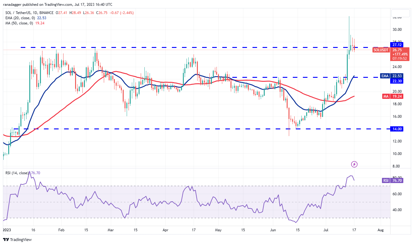Generally, the tightening of the range is followed by a sharp breakout. If buyers thrust the price above $29.12, the SOL/USDT pair could jump to $32.13. A rally above this level could open the doors for a further rise to $38.