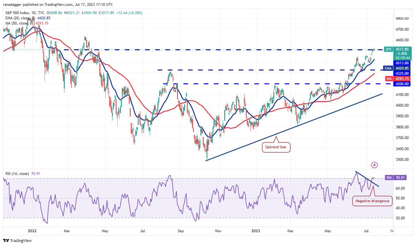 On the way down, the 20-day exponential moving average (EMA) of 4,420 is the important support level to watch out for. If this support gives way, it will signal that the bulls may be booking profits. That may sink the price to the 50-day simple moving average (SMA) of 4,293.