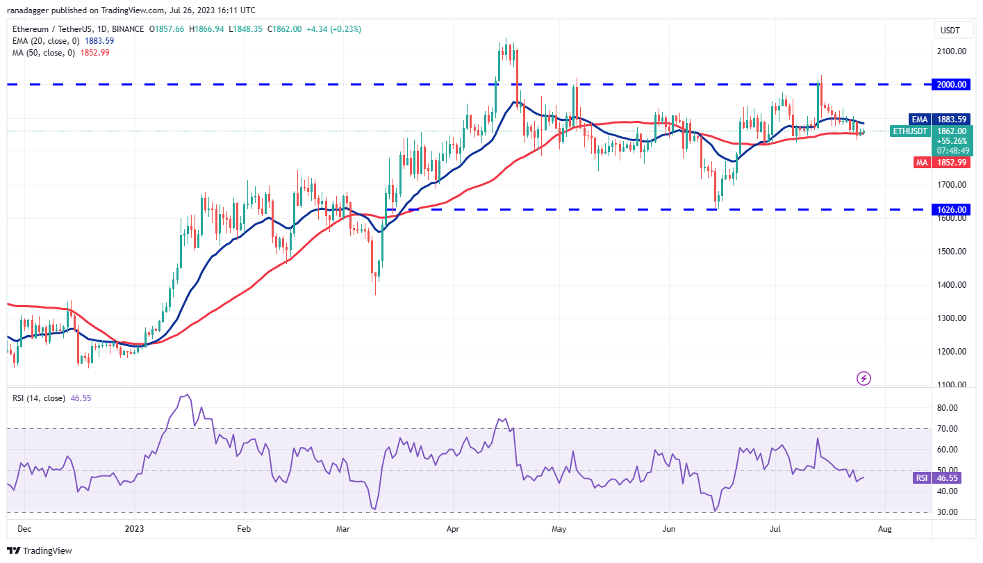 If the 50-day SMA support cracks, the ETH/USDT pair may start a downward move to $1,700 and subsequently to $1,626. Such a move will indicate that the pair may remain stuck inside the large range between $1,626 and $2,000 for a while longer.
