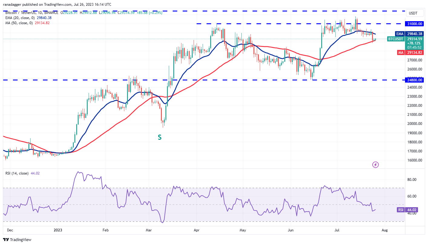 The downsloping 20-day exponential moving average (EMA) of $29,840 and the relative strength index (RSI) in the negative territory indicate that the path of least resistance is to the downside. If the 50-day SMA gives way, the BTC/USDT pair may tumble to $27,500 and then to $26,000.