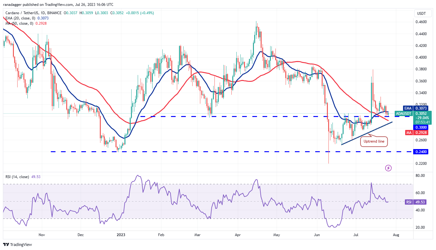 Cardano (ADA) skidded below the 20-day EMA ($0.30) on July 24 and reached the strong support at $0.30. The bulls are defending this level but have failed to achieve a strong bounce off it.