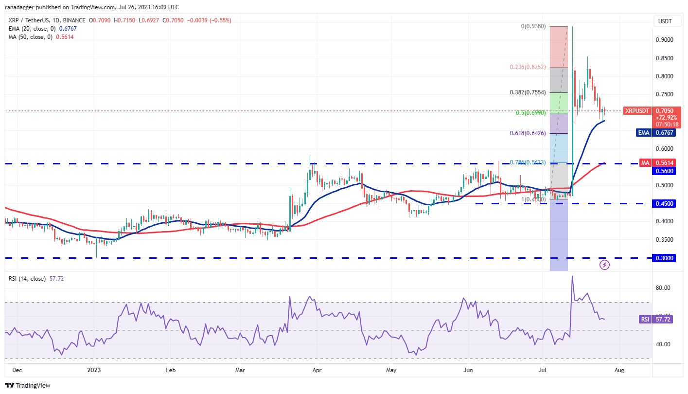 XRP (XRP) rebounded off the 20-day EMA ($0.67) on July 25, but the bulls could not build upon this strength. This suggests that demand dries up at higher levels.