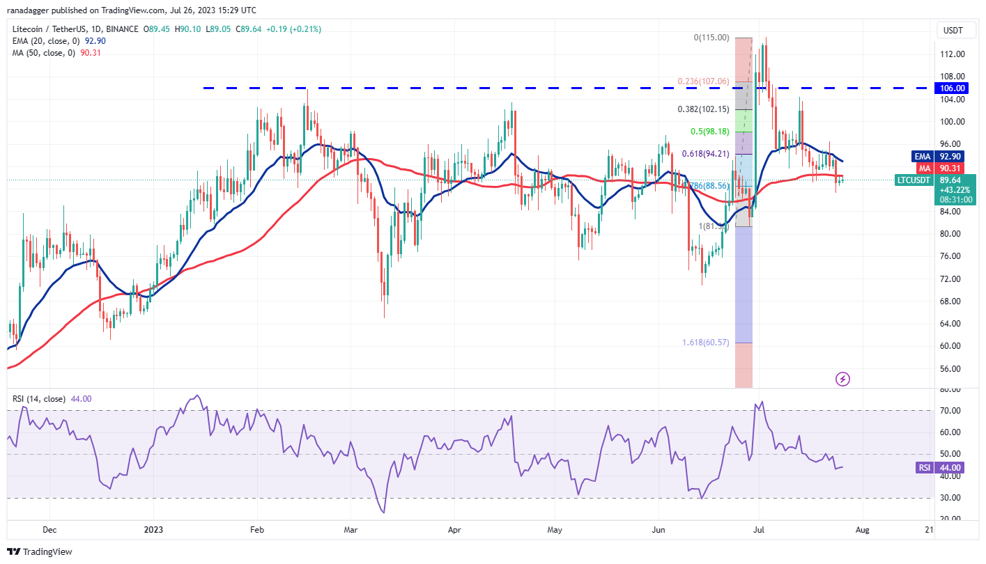 Litecoin (LTC) turned down from the 20-day EMA ($92) on July 24 and plunged below the 50-day SMA ($90). The bulls are trying to push the price back above the 50-day SMA, but the bears have held their ground.