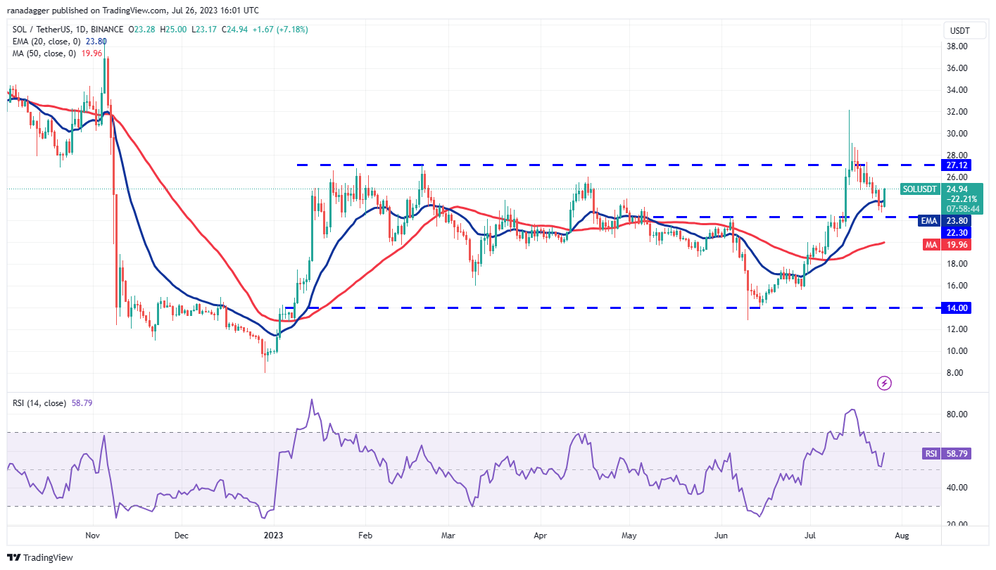 The bulls purchased the dip and pushed the price back above the 20-day EMA on July 26. This suggests that the SOL/USDT pair may oscillate between $22.30 and $27.12 for a few days. The flattish 20-day EMA and the RSI in the positive territory also point to a possible consolidation in the near term.