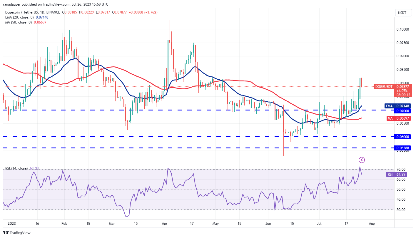 Dogecoin (DOGE) turned up from $0.07 on July 23, indicating that the bulls have flipped the level into support.