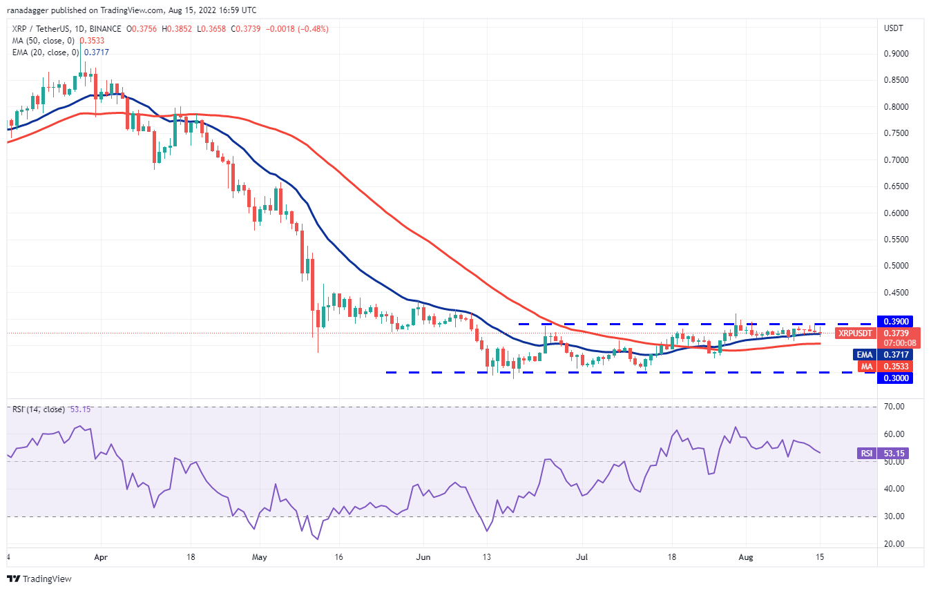 The bulls tried to push XRP above the overhead resistance at $0.39 on Aug. 13 and 14 but the bears held their ground. This may have attracted profit-booking from the short-term traders, which pulled the price below the 20-day EMA ($0.37).