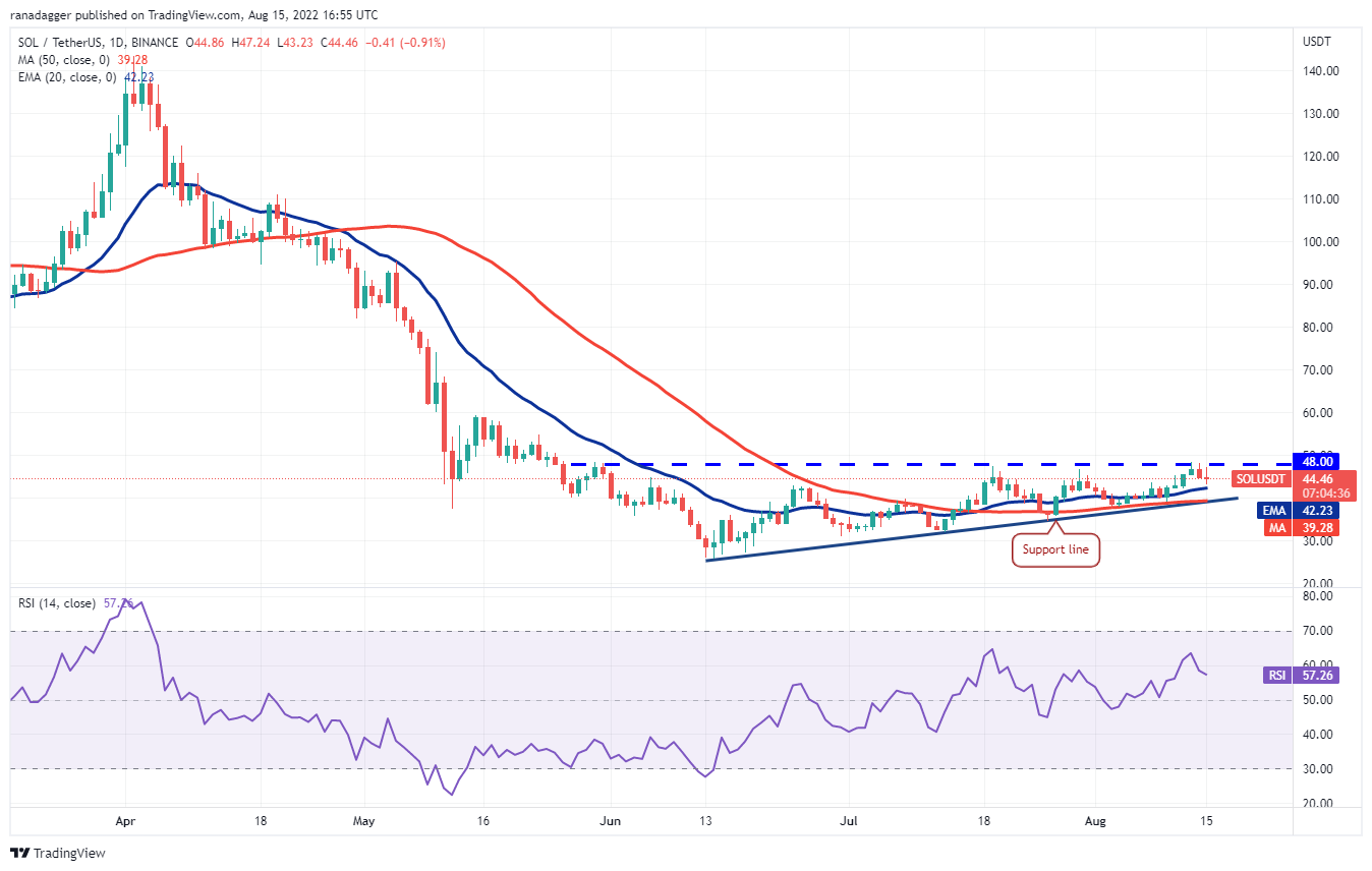Solana (SOL) rose to the overhead resistance at $48 on Aug. 13 but the bulls could not overcome this barrier. The bulls again tried to clear the overhead hurdle on Aug. 15 but the bears did not relent.