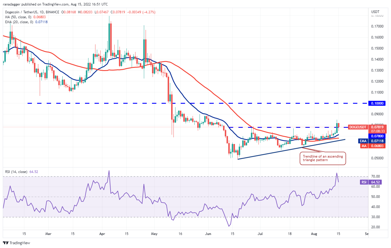 Dogecoin (DOGE) bounced off the 20-day EMA ($0.07) on Aug. 12 and broke above the overhead resistance at $0.08 on Aug. 14. This completed the bullish ascending triangle pattern but the bulls could not sustain the breakout.