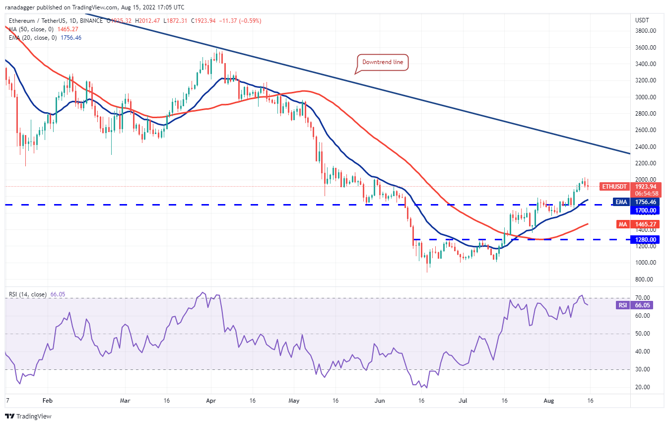 The bulls tried to resume the up-move in Bitcoin but the bears sold aggressively at $25,211 and pulled the price down to the 20-day exponential moving average (EMA) ($23,483). This resulted in the formation of an outside-day candlestick pattern on Aug. 15.