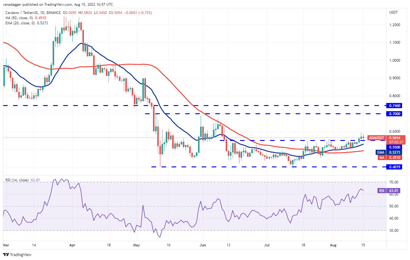 The price turned down on Aug. 15 and reached the breakout level of $0.55. The zone between $0.55 and the 20-day EMA ($0.53) is likely to attract strong buying by the bulls. If the price rebounds off this zone, the buyers will again attempt to resume the up-move and push the ADA/USDT pair to $0.63 and then to $0.70.