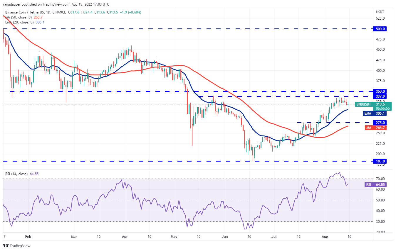 If the price rebounds off this support, the buyers will make another attempt to push the BNB/USDT pair above the $338 to $350 resistance zone. The upsloping 20-day EMA and the RSI in the positive territory indicate the path of least resistance is to the upside.