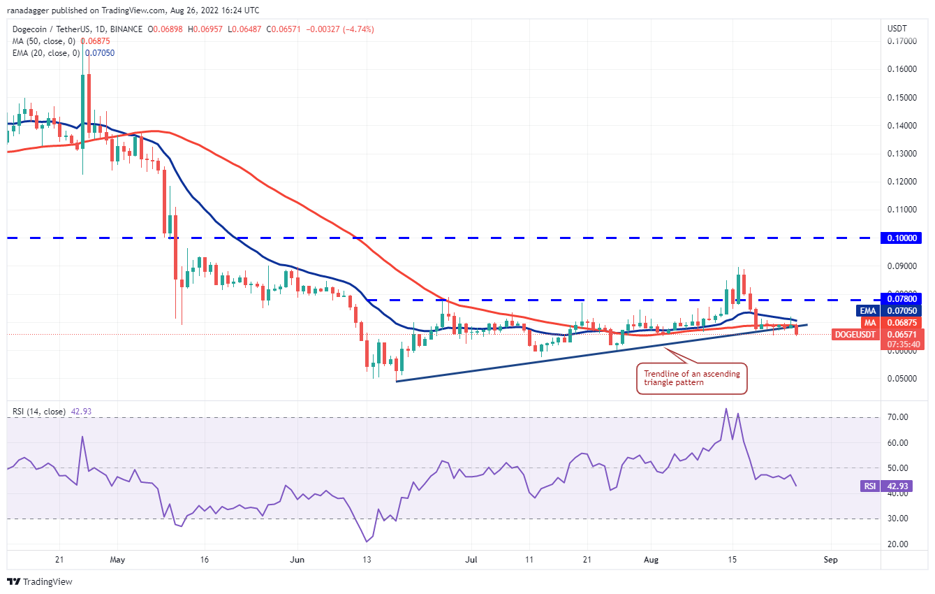 Dogecoin (DOGE) marginally rose above the 20-day EMA ($0.07) on Aug. 25 but the bulls could not sustain the higher levels. This suggests that bears are defending the level aggressively.