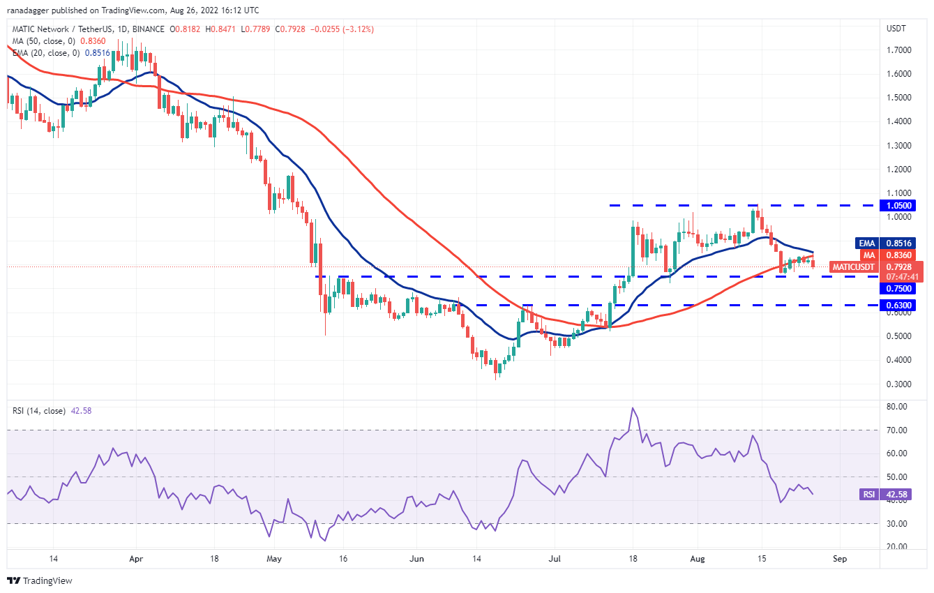 Polygon’s (MATIC) rebound off the strong support at $0.75 is facing resistance near the 20-day EMA ($0.85). This suggests that the sentiment remains negative and bears are selling on rallies.