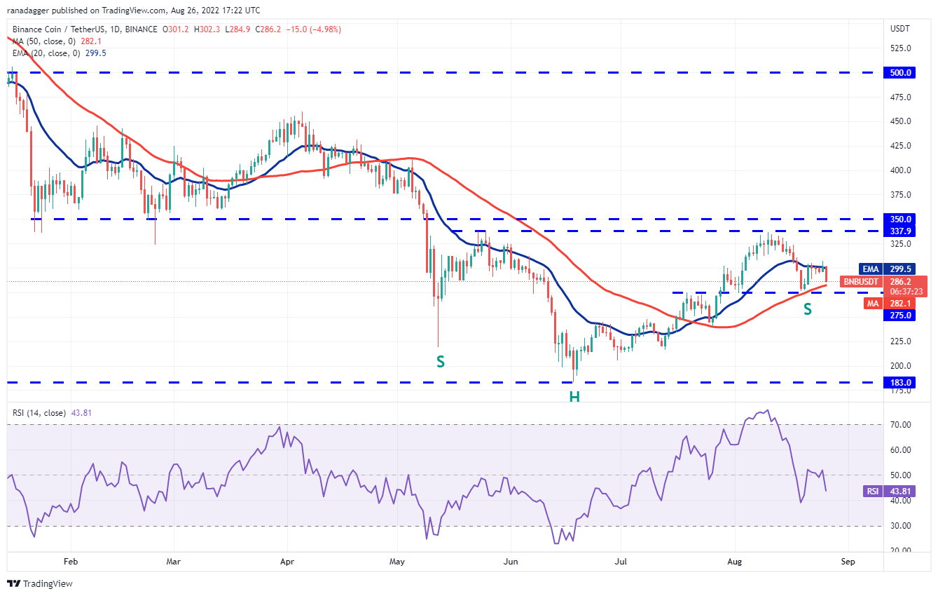 The price has turned down on Aug. 26 and the bears are attempting to sink the price below the immediate support at $275. If they succeed, the BNB/USDT pair could complete a bearish head and shoulders pattern. That could result in a decline to $240 and then to the pattern target at $212.