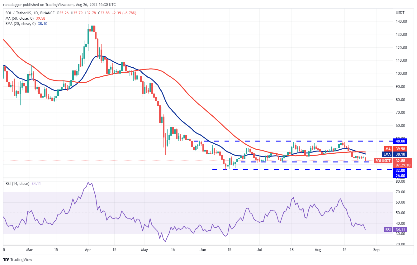 The 20-day EMA ($38) is sloping down and the RSI is in the negative territory, indicating advantage to bears. If the $32 support collapses, the SOL/USDT pair could drop to the vital support at $26. This is an important level to keep an eye on because a break below it could signal the resumption of the downtrend.