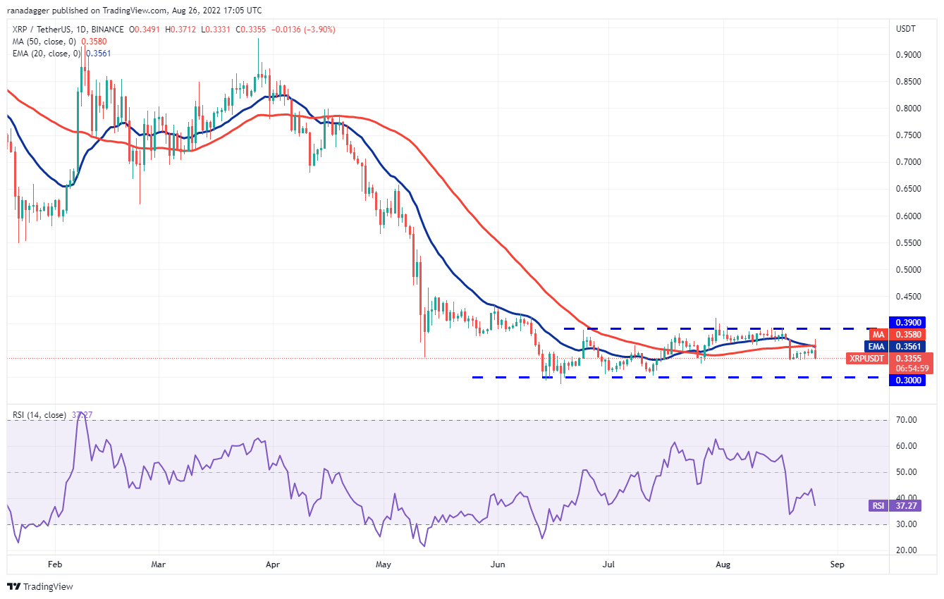 The bulls pushed BNB above the 20-day EMA ($300) on Aug. 25 but the long wick on the candlestick suggests that bears are selling at higher levels.