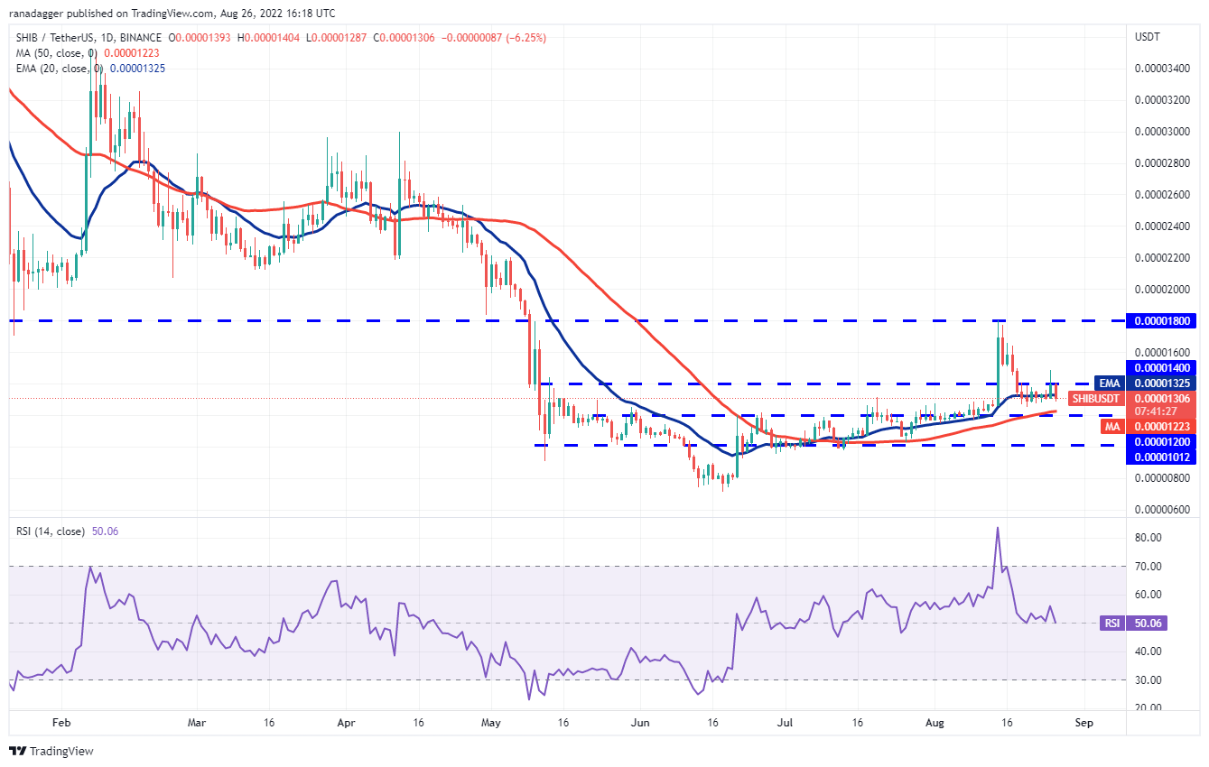 The sellers are currently attempting to sustain the price below the 20-day EMA ($0.000013). If they succeed, the SHIB/USDT pair could drop to the next support at $0.000012. This is an important level for the bulls to defend because if it cracks, the decline could extend to $0.000010.