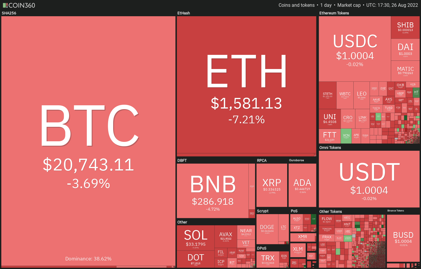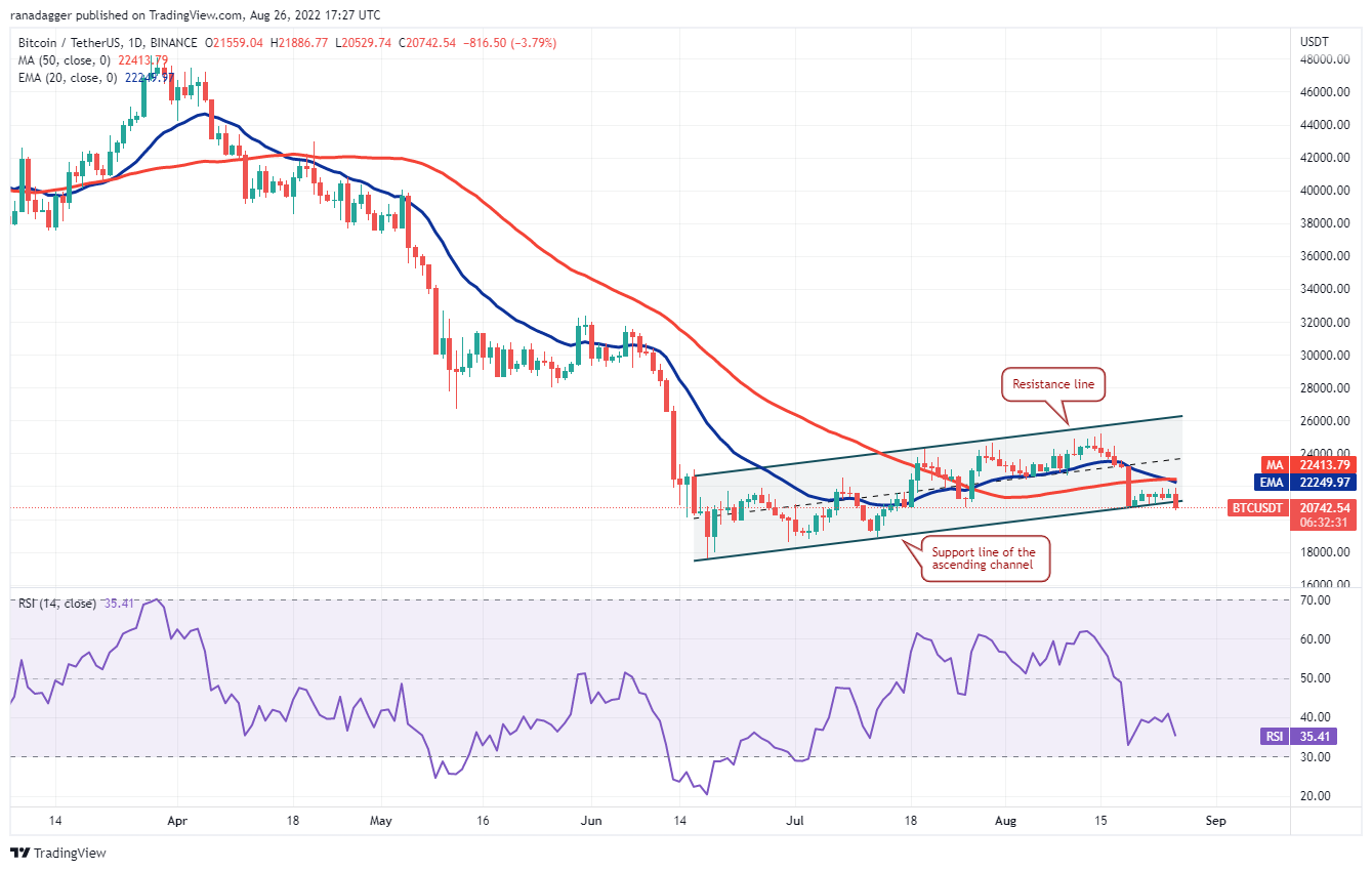 Strong selling has pulled the price below the ascending channel on Aug. 26. If bears sustain the price below $20,762, the selling could intensify and the BTC/USDT pair could drop to $18,900. This level may again act as a strong support but if it breaks, the decline could extend to the June 18 intraday low at $17,622.