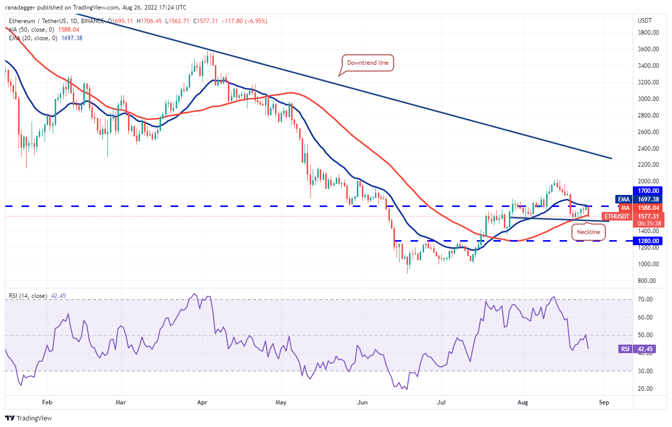Buyers could not push Ether (ETH) above the 20-day EMA ($1,697) on Aug. 25, indicating that bears are defending this level with vigor.