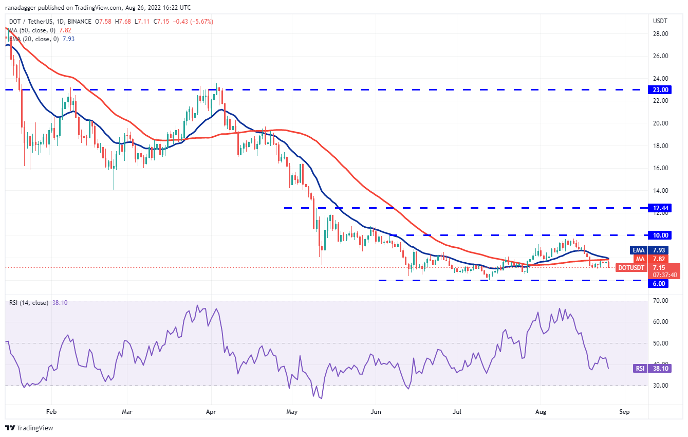 The bulls could not push Polkadot (DOT) above the 50-day SMA ($7.82) in the past few days, indicating that bears continue to sell on minor rallies.