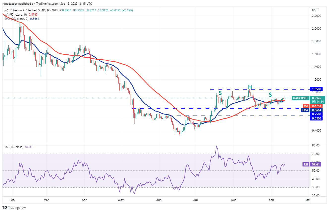 Polygon (MATIC) broke and closed above the moving averages on Sept. 9 but the bulls could not build upon this advantage and push the price above the immediate resistance at $0.92.