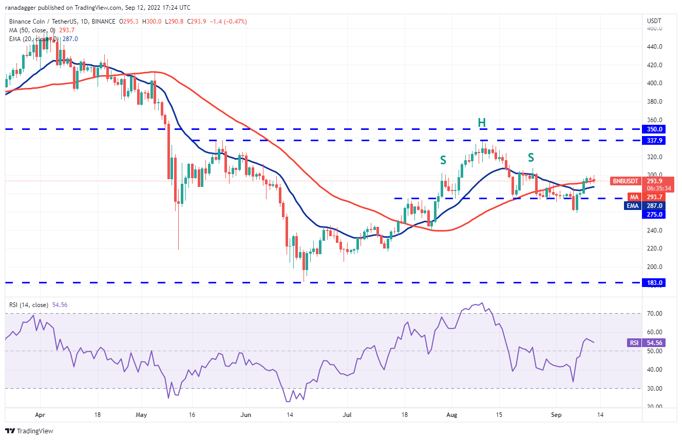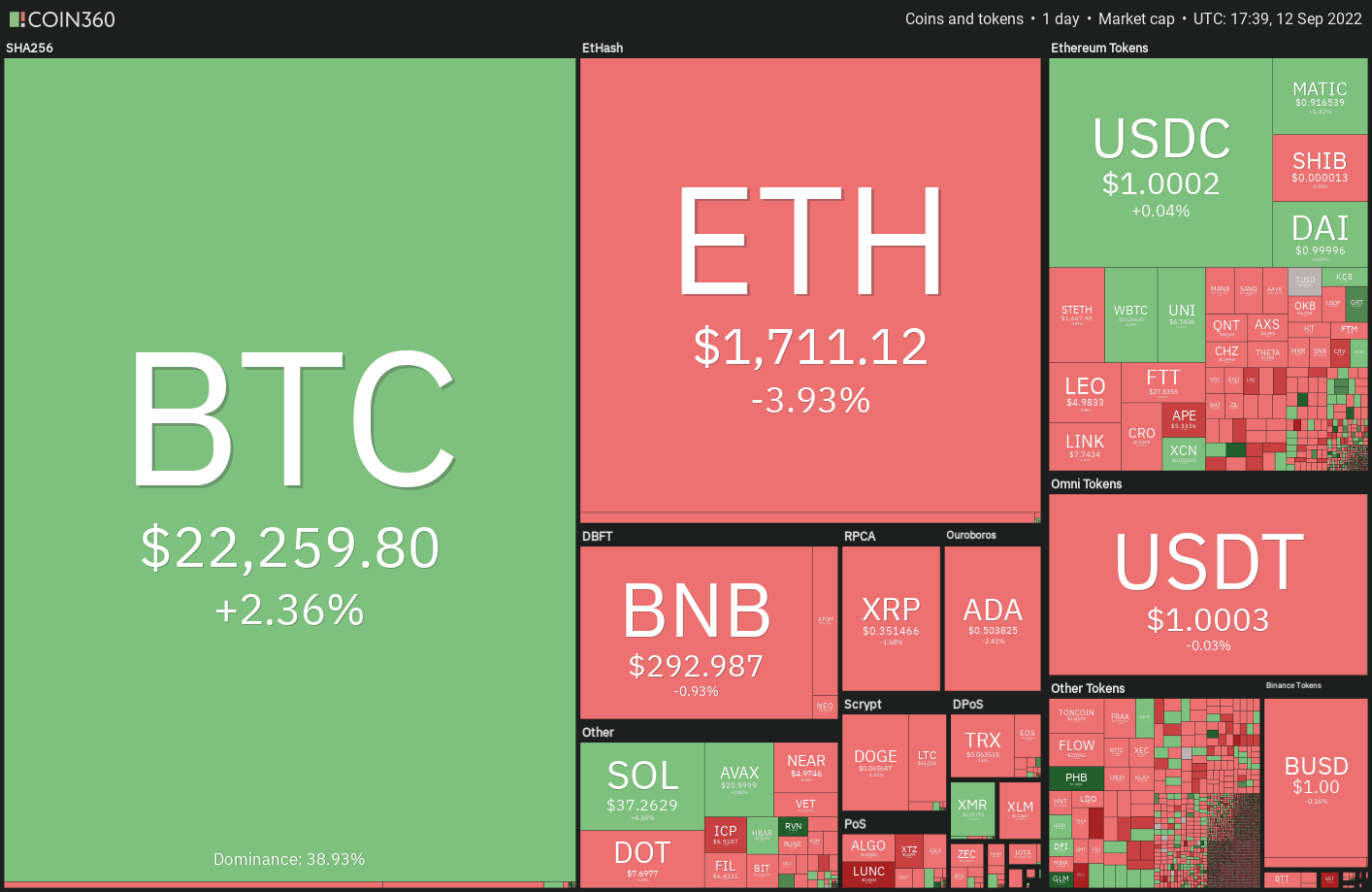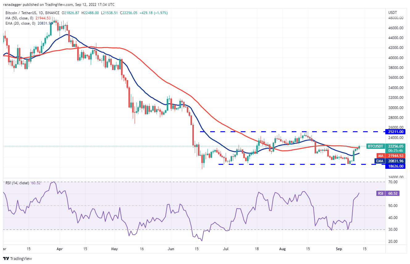 Bitcoin is attempting to form a bottom. Buyers pushed the price above the 20-day exponential moving average (EMA) ($20,831) on Sept. 9 and the 50-day simple moving average (SMA) ($21,944) on Sept. 12. This suggests that the bears may be losing momentum.
