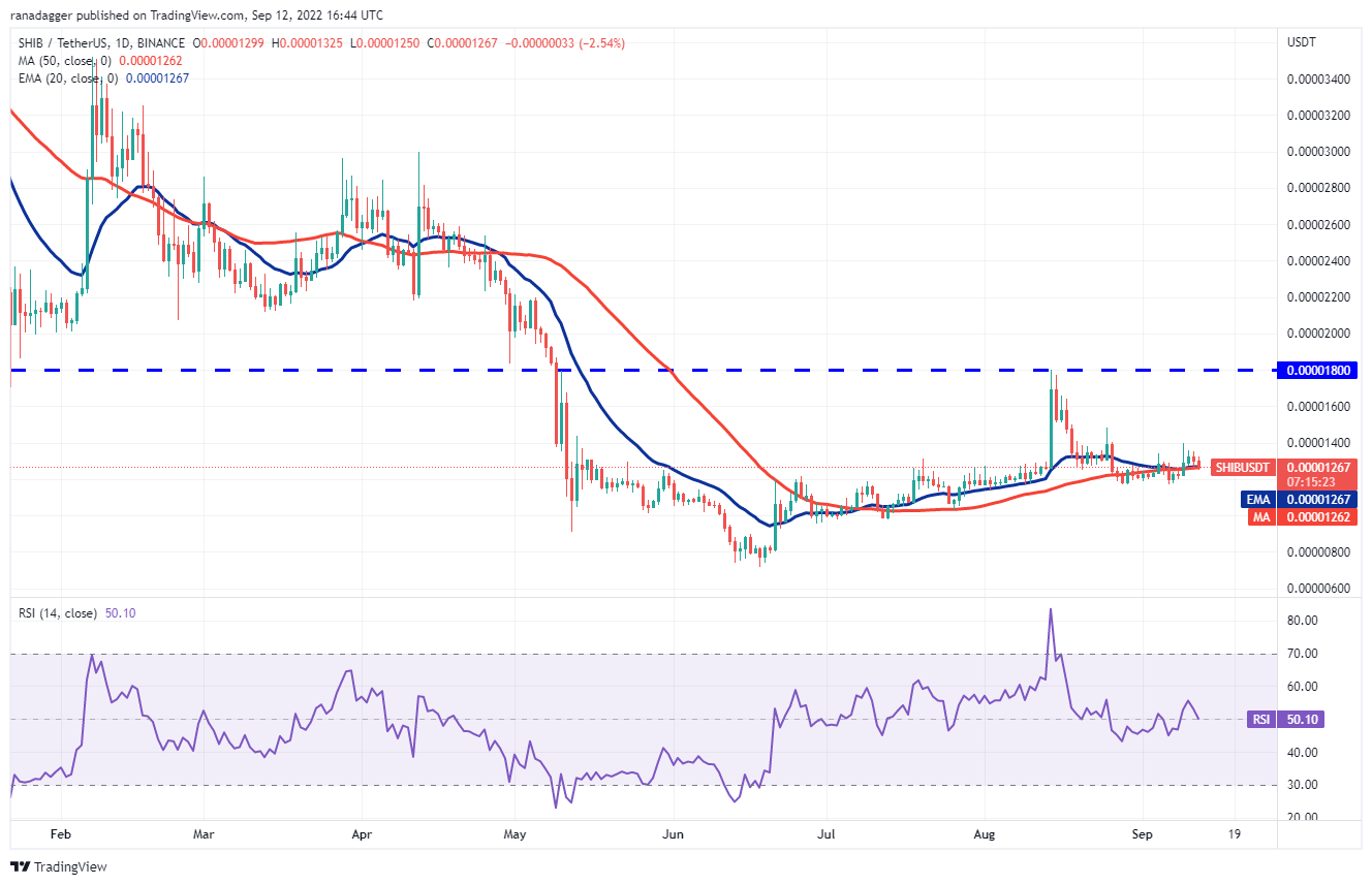 Shiba Inu (SHIB) broke and closed above the moving averages on Sept. 9 but the long wick on the day’s candlestick shows selling at higher levels. A minor positive is that bulls have not allowed the price to break below the moving averages.