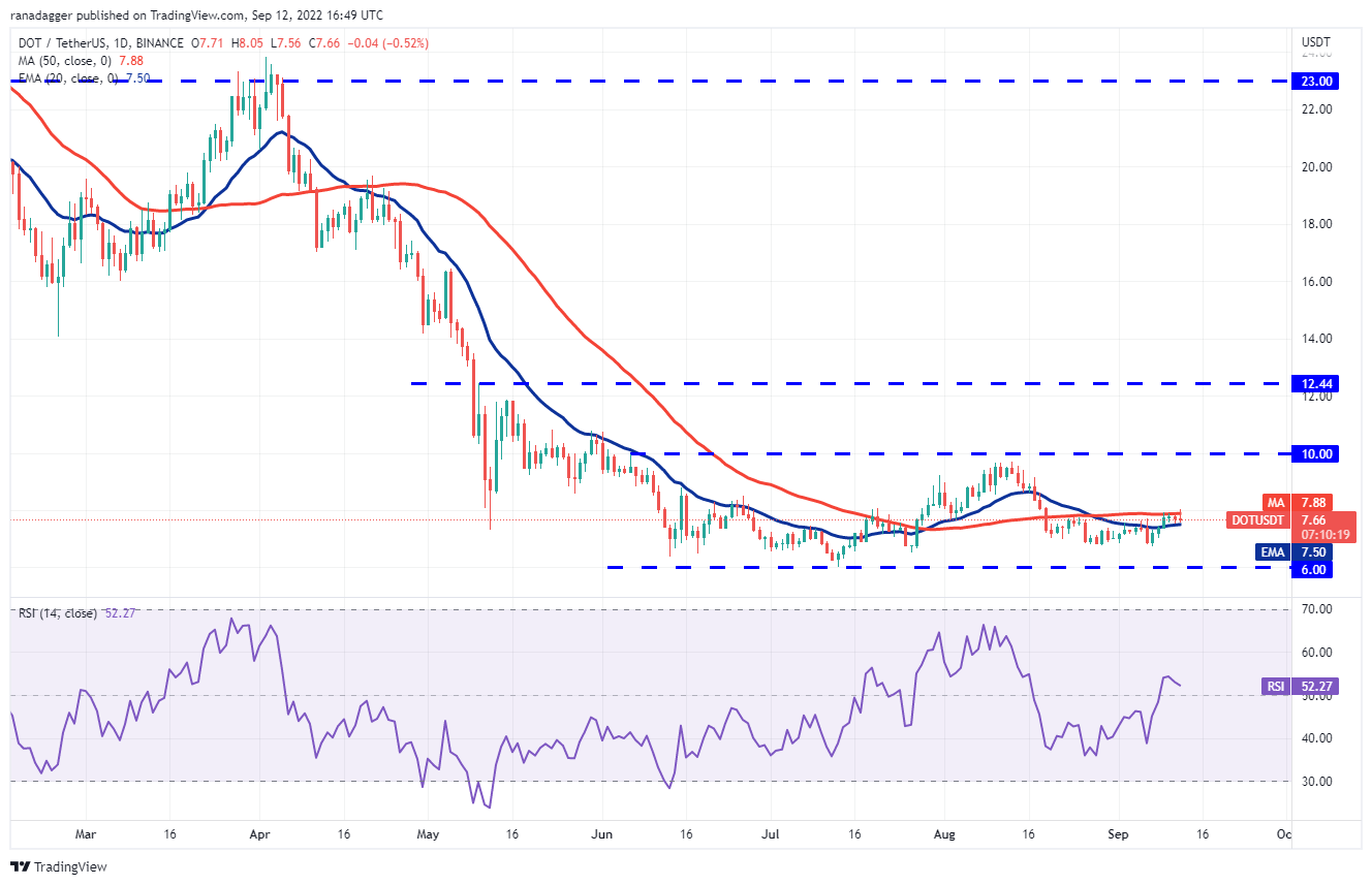 Polkadot (DOT) reached the 50-day SMA ($7.88) on Sept. 9 where the bears are mounting a strong resistance. The sellers tried to pull the price back below the 20-day EMA ($7.50) on Sept. 11 but the bulls held their ground.