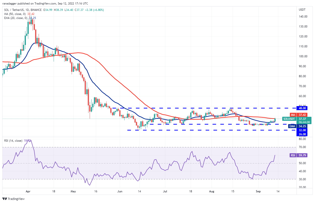The bulls are attempting to extend the recovery by pushing the price above the 50-day SMA ($37.42) on Sept. 12. If they succeed, the SOL/USDT pair could pick up momentum and rally toward the overhead resistance at $48. This level is likely to act as a strong barrier but if bulls overcome it, the pair could signal the start of a new up-move.