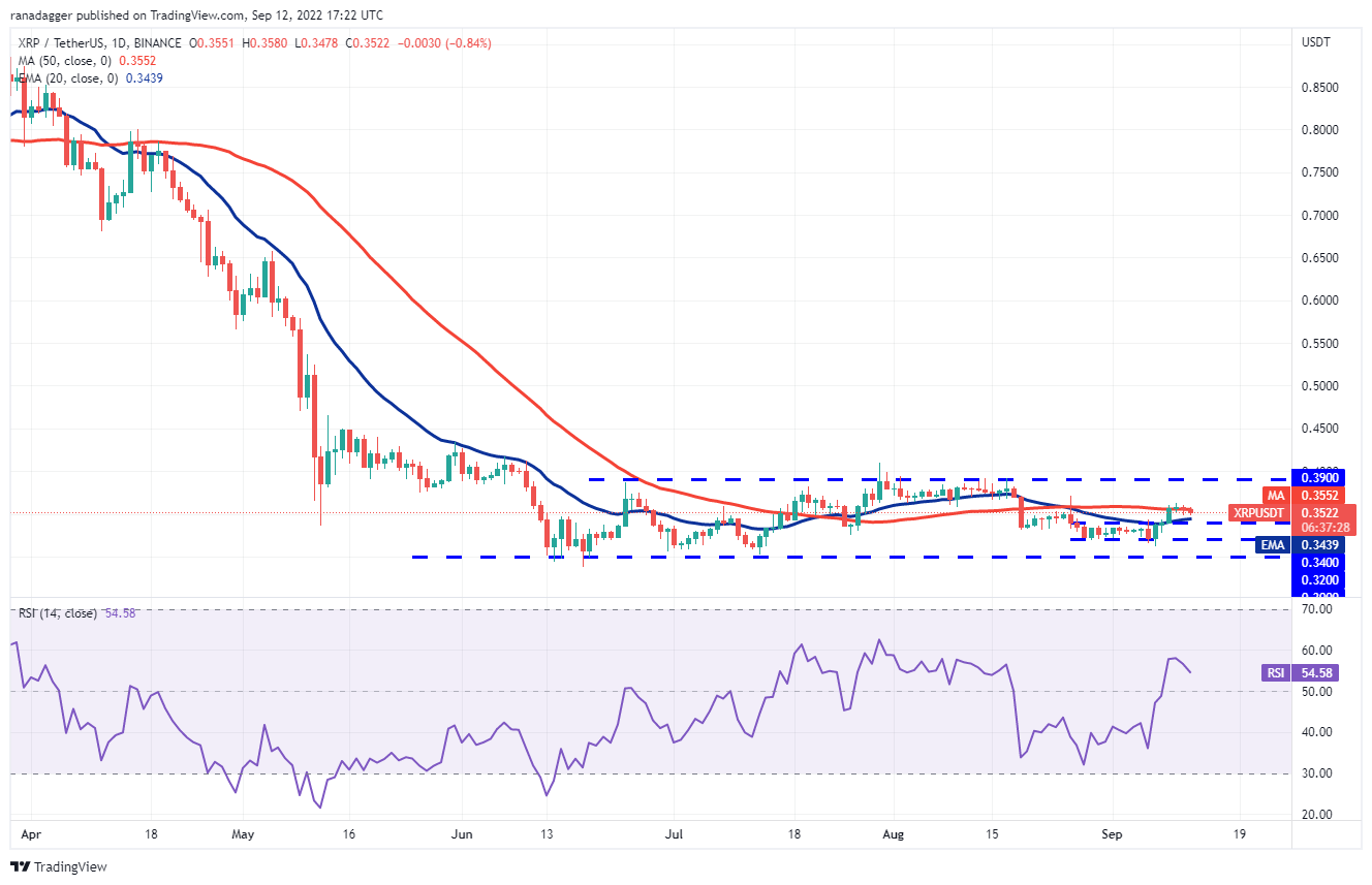 Ripple’s (XRP) tight range trading between $0.32 and $0.34 resolved to the upside on Sept. 9, and the price reached the 50-day SMA ($0.35) The bears are attempting to stall the recovery at this level but they have not been able to pull the price below the 20-day EMA ($0.34). This suggests strong buying at lower levels.