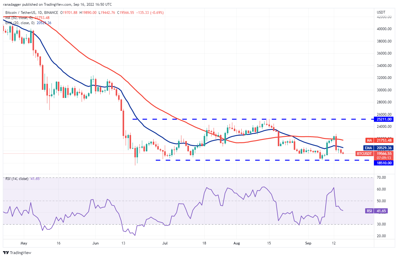 Contrarily, if the price turns down from the current level or the 20-day EMA, it will suggest that the sentiment remains negative and traders are viewing rallies as a selling opportunity. That could sink the pair to the strong support at $18,510. The zone between $18,510 and $17,622 could witness aggressive buying from the bulls because the failure to defend this zone may start the next leg of the downtrend.