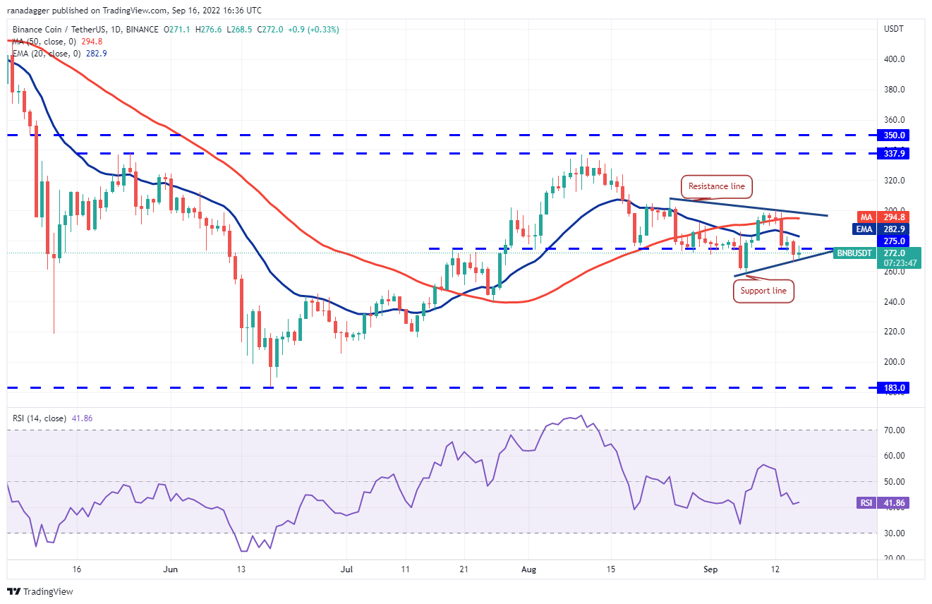 If the price sustains above $275, the BNB/USDT pair could be in the early stages of forming a symmetrical triangle. This suggests uncertainty about the next directional move among the bulls and the bears. That could keep the price inside the triangle for some time.