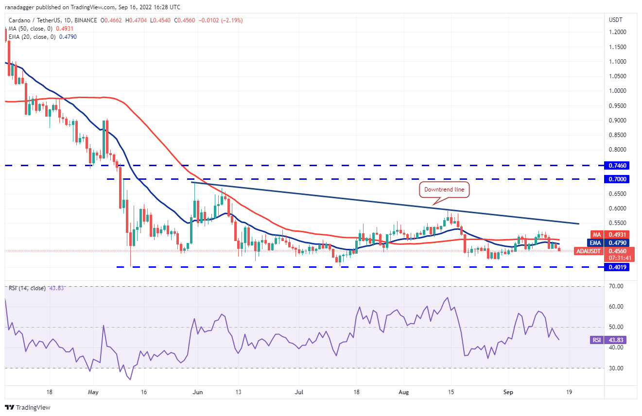 The bears are attempting to build upon their advantage in Cardano (ADA). They sold the recovery to the 20-day EMA ($0.48) on Sept. 14 and are trying to pull the price below the immediate support at $0.45.