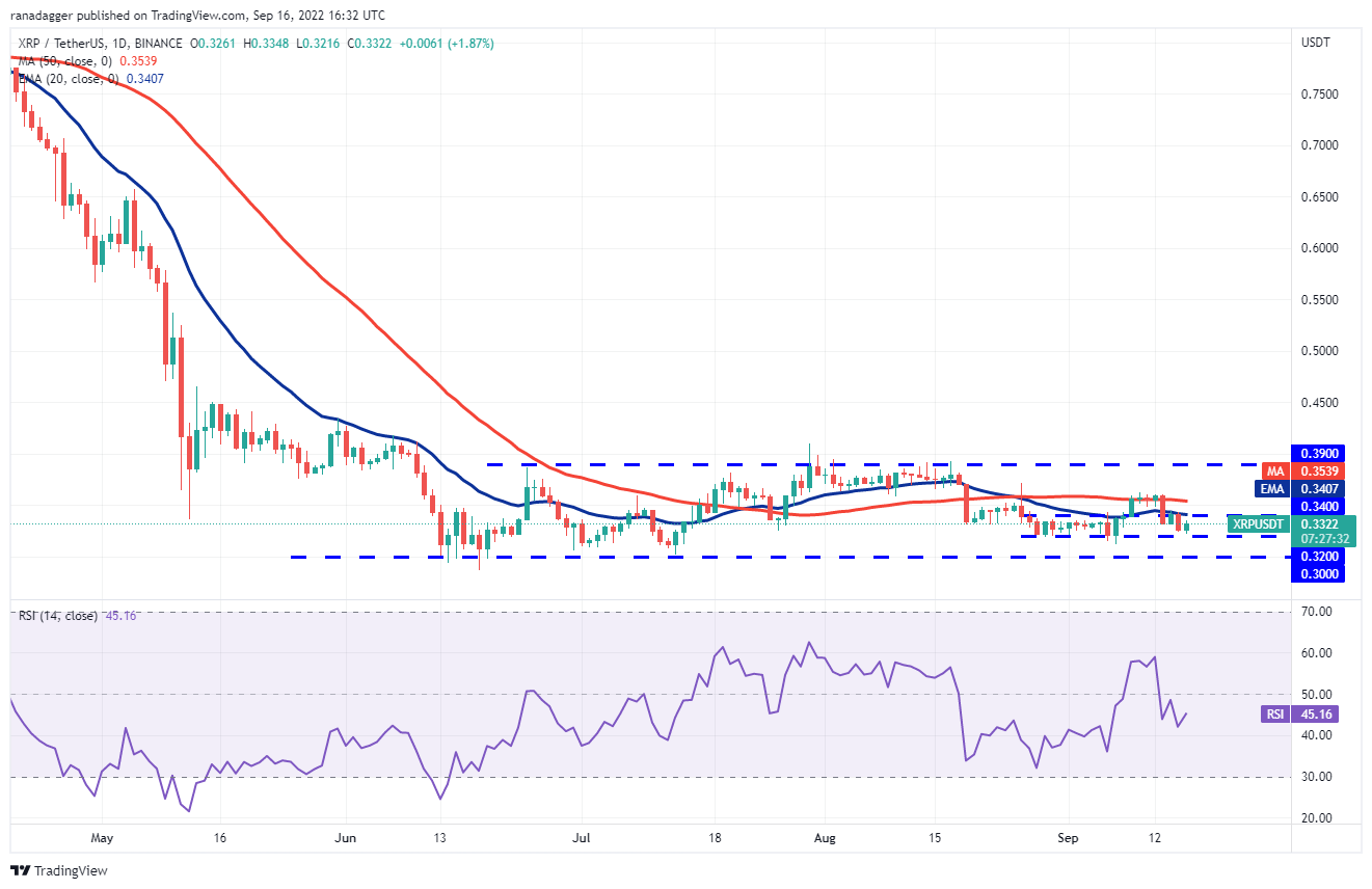The price action inside a range is usually volatile and difficult to call. Still, as the buyers had successfully defended the $0.32 support between Aug. 28 and Sept. 7, they will again try to do that. If the price rises from the current level, the XRP/USDT pair could rally to the 20-day EMA ($0.34) and later to the 50-day SMA.