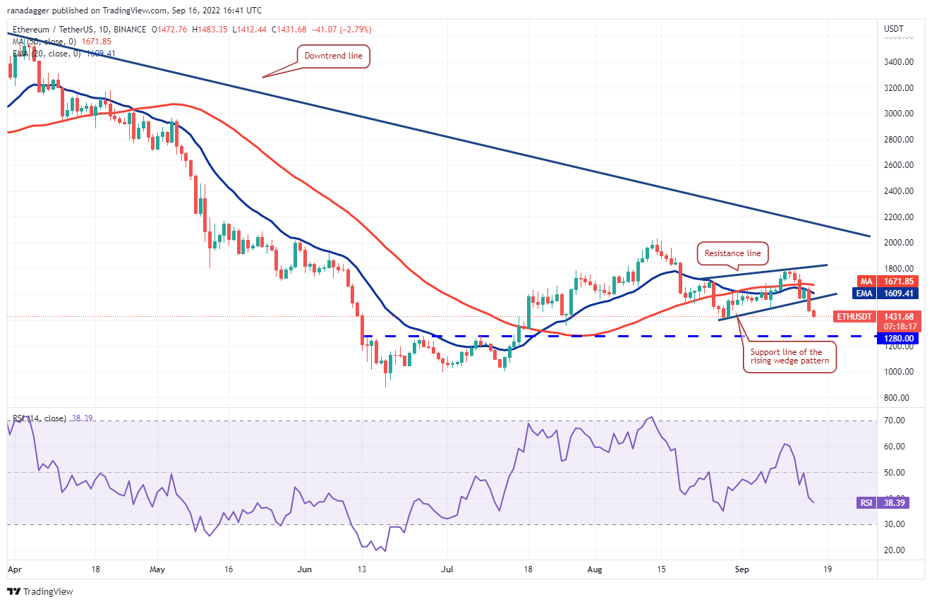 Ether (ETH) bounced off the support line on Sept. 14 but the joy of the bulls proved to be short-lived. The price turned down sharply from the 20-day EMA ($1,609) and plunged below the support line on Sept. 15.