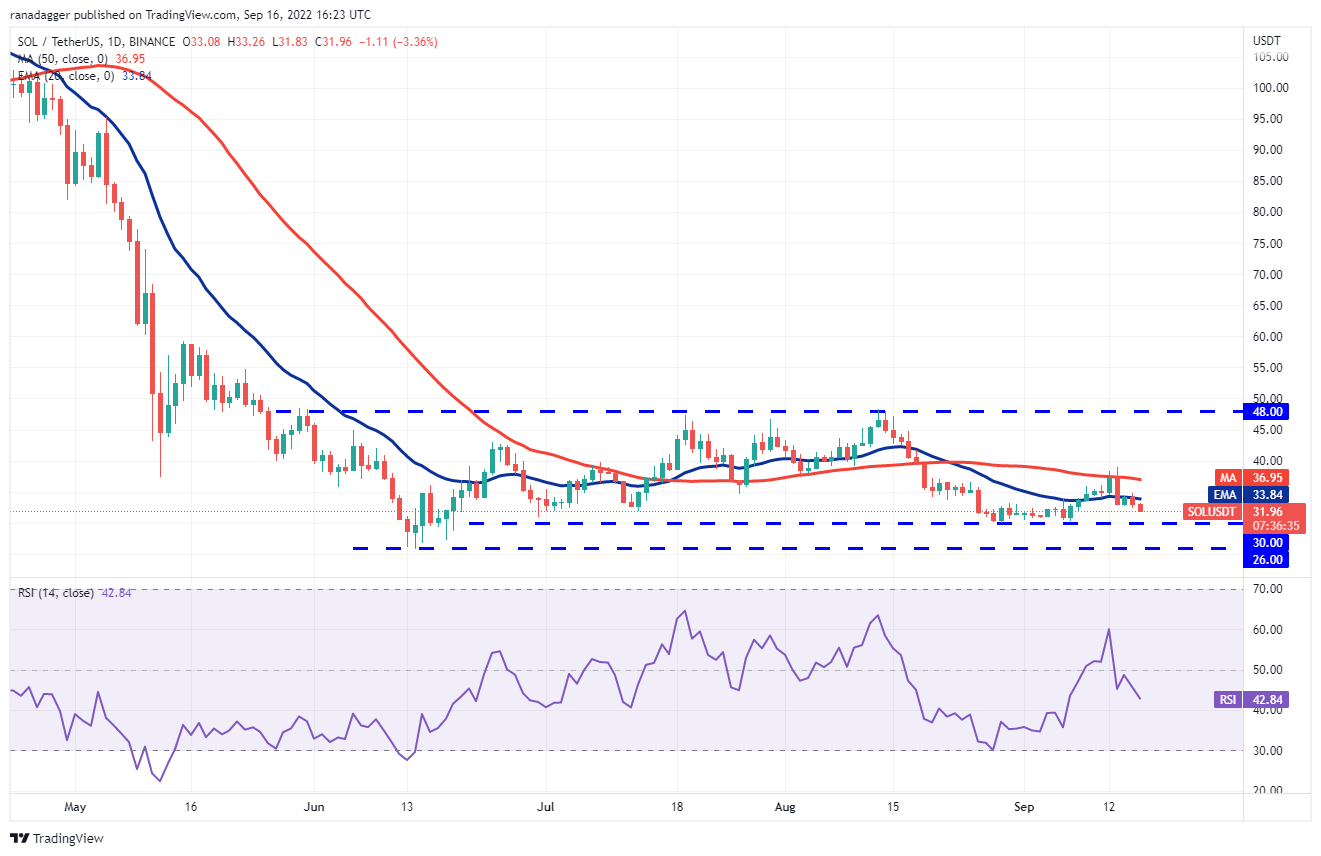 Solana (SOL) turned down from the 20-day EMA ($33.84) on Sept. 15, indicating that the sentiment remains negative and bears are selling on minor rallies.