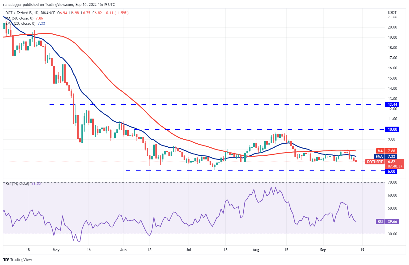 The bulls attempted to start arecovery on Sept. 14 but higher levels attracted selling by the bears. Polkadot (DOT) turned down on Sept. 15 and the bears are trying to sink the price below the immediate support of $6.75.