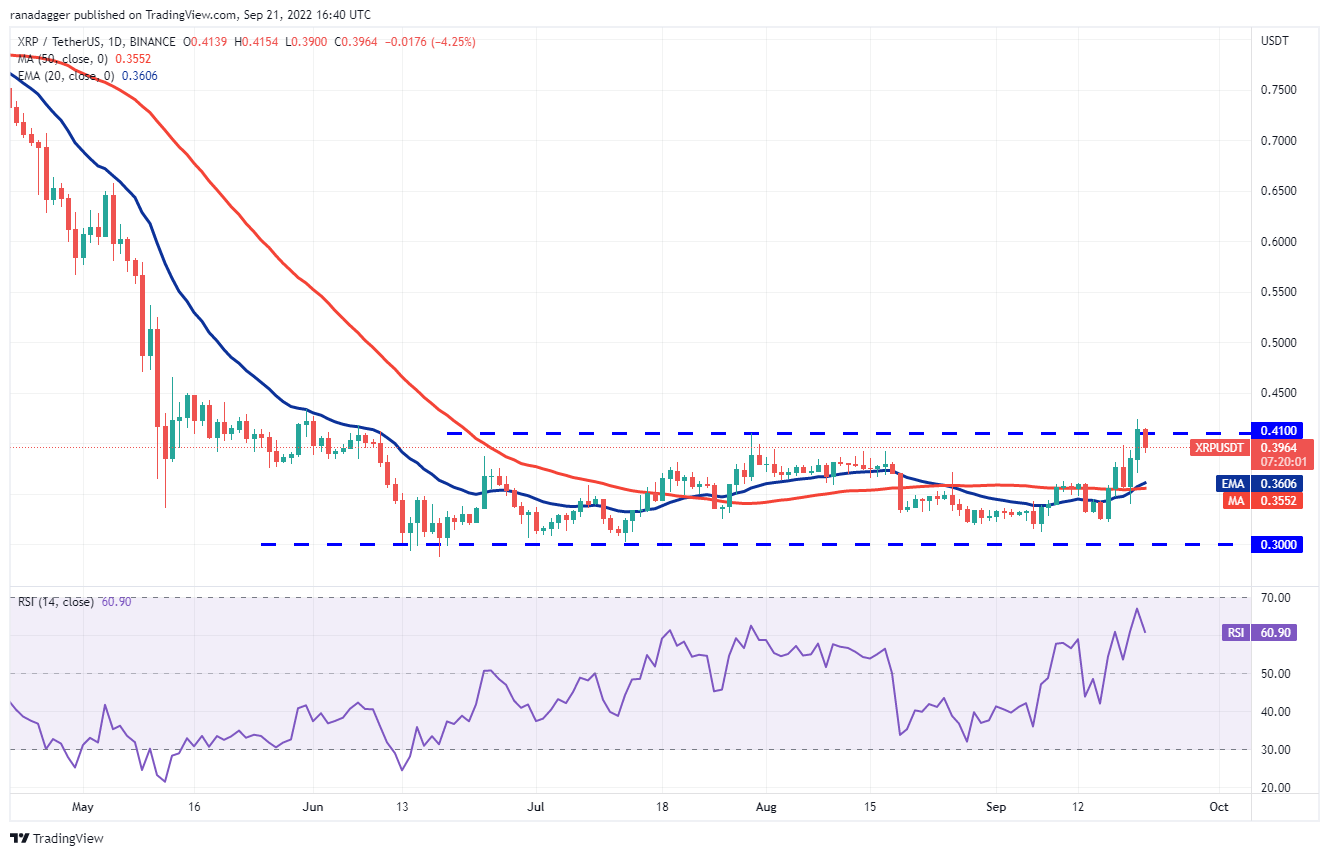 XRP broke and closed above the overhead resistance at $0.41 on Sept. 20 but the bulls could not build upon this strength. The bears pulled the price back into the range on Sept. 21.