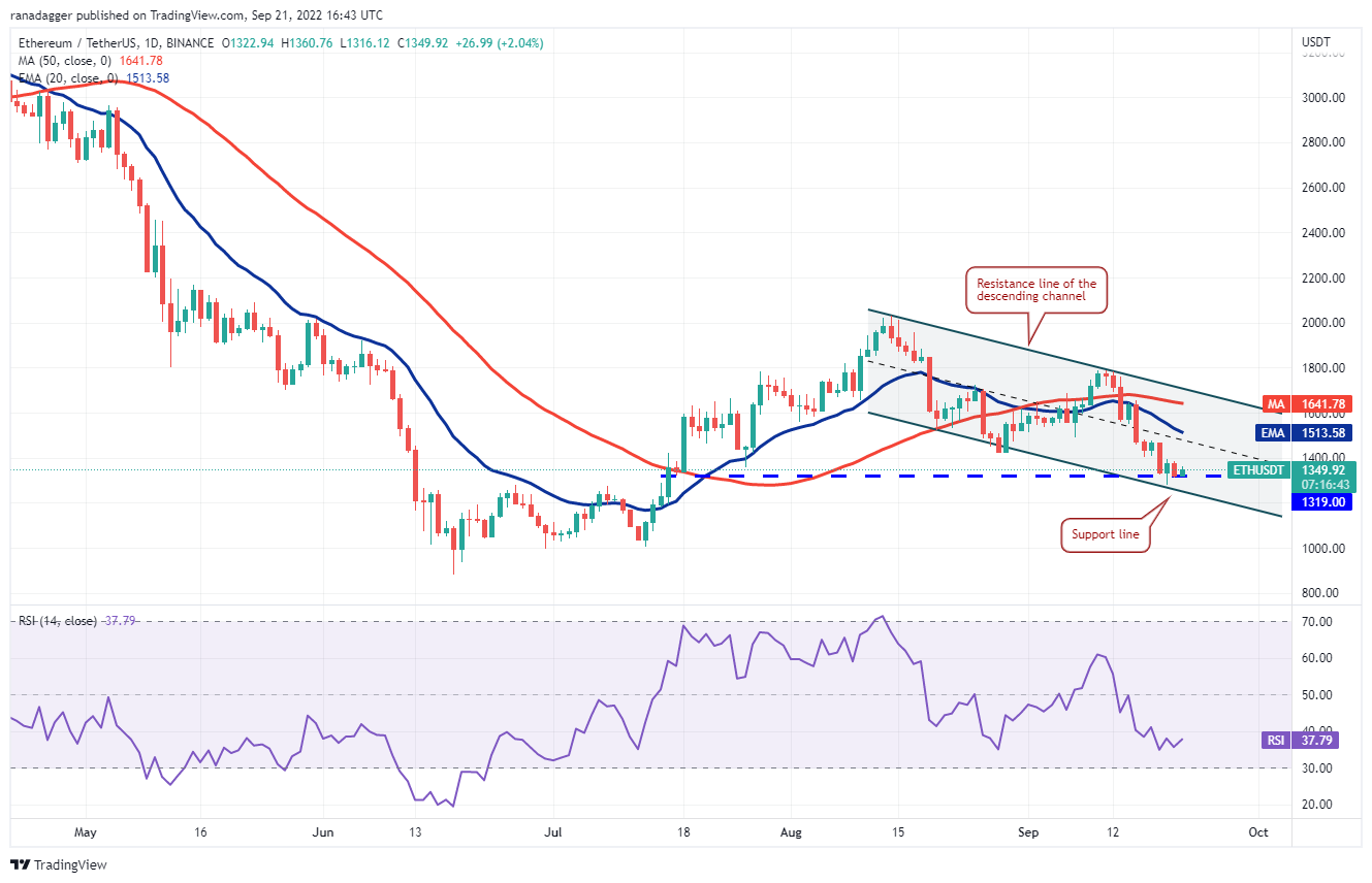 The bulls are attempting to start a relief rally which could pick up strength above $1,400. If this level is conquered, the ETH/USDT pair could rise to the 20-day EMA ($1,513). This level could be the real test for the bulls in the near term because a break above it could clear the path for a possible rally to the resistance line of the channel.
