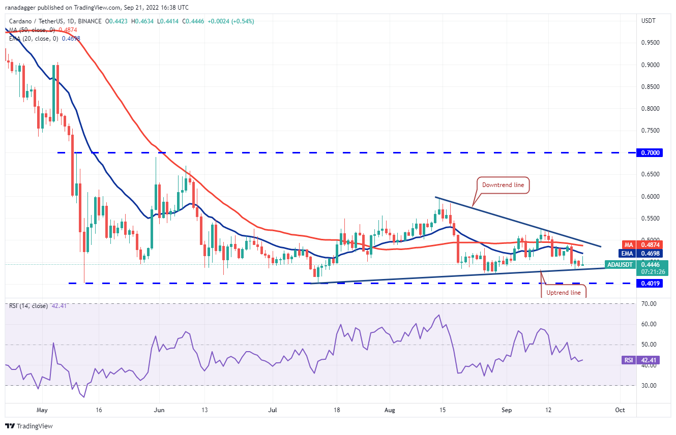 Buyers are trying to sustain Cardano (ADA) above the uptrend line. The bulls tried to push the price higher on Sept. 21 but the long wick on the candlestick shows that bears are selling on intraday rallies.