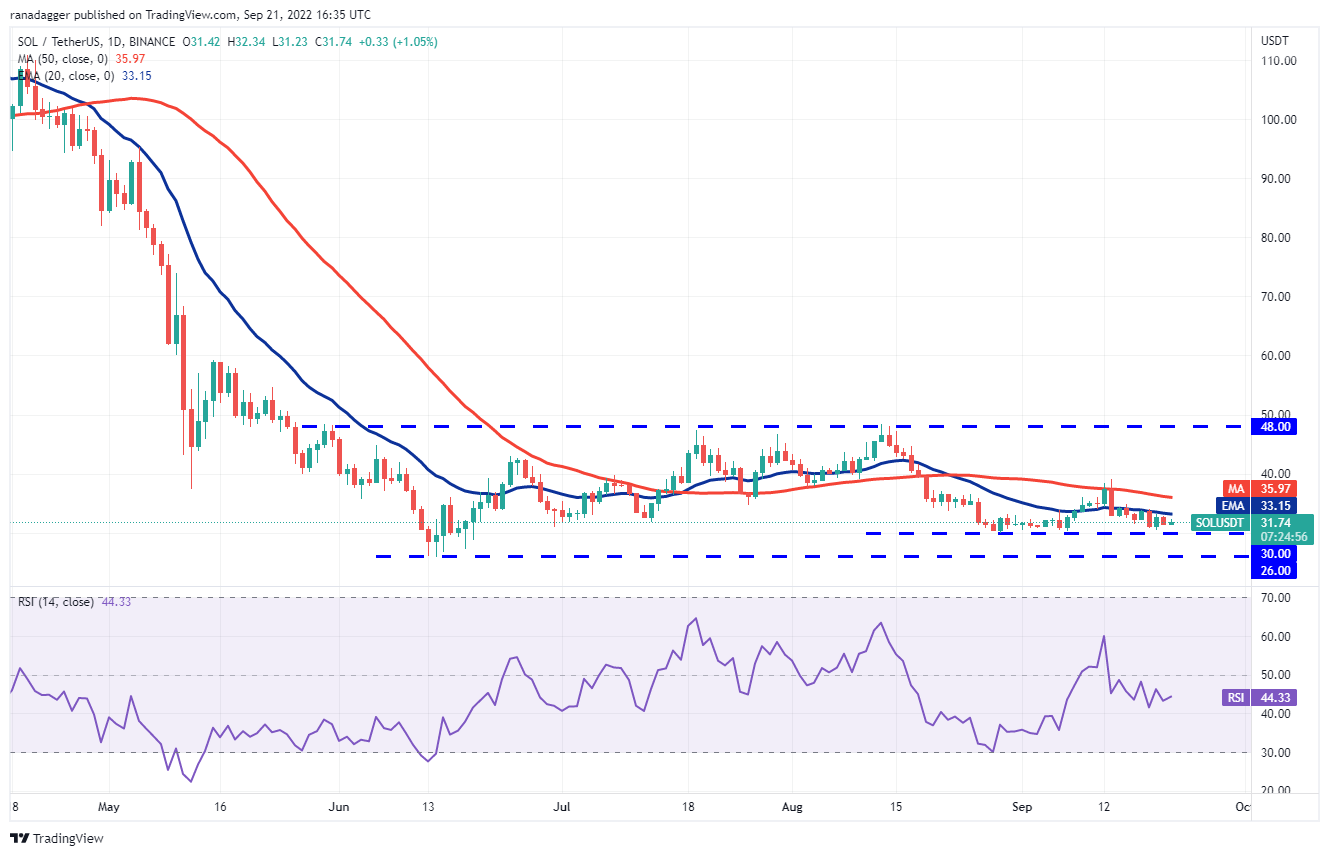 Solana (SOL) bounced off the immediate support at $30 but the bulls could not push the price above the 20-day EMA ($33). This indicates that bears are active at higher levels.