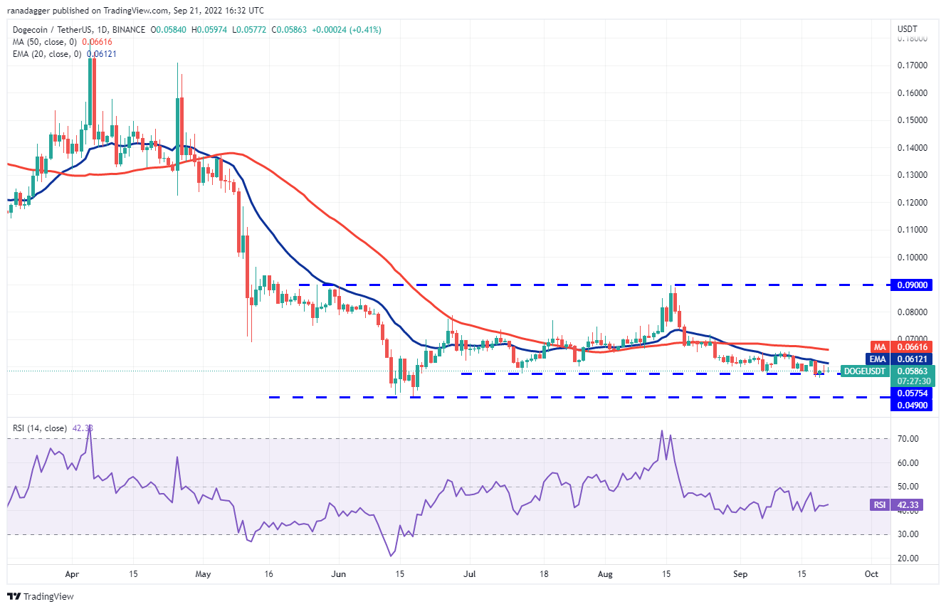 Dogecoin (DOGE) is getting squeezed between the 20-day EMA ($0.06) and the immediate support at $0.06. This suggests that the bulls are buying the dips but they continue to face strong resistance from the bears on every minor rally.