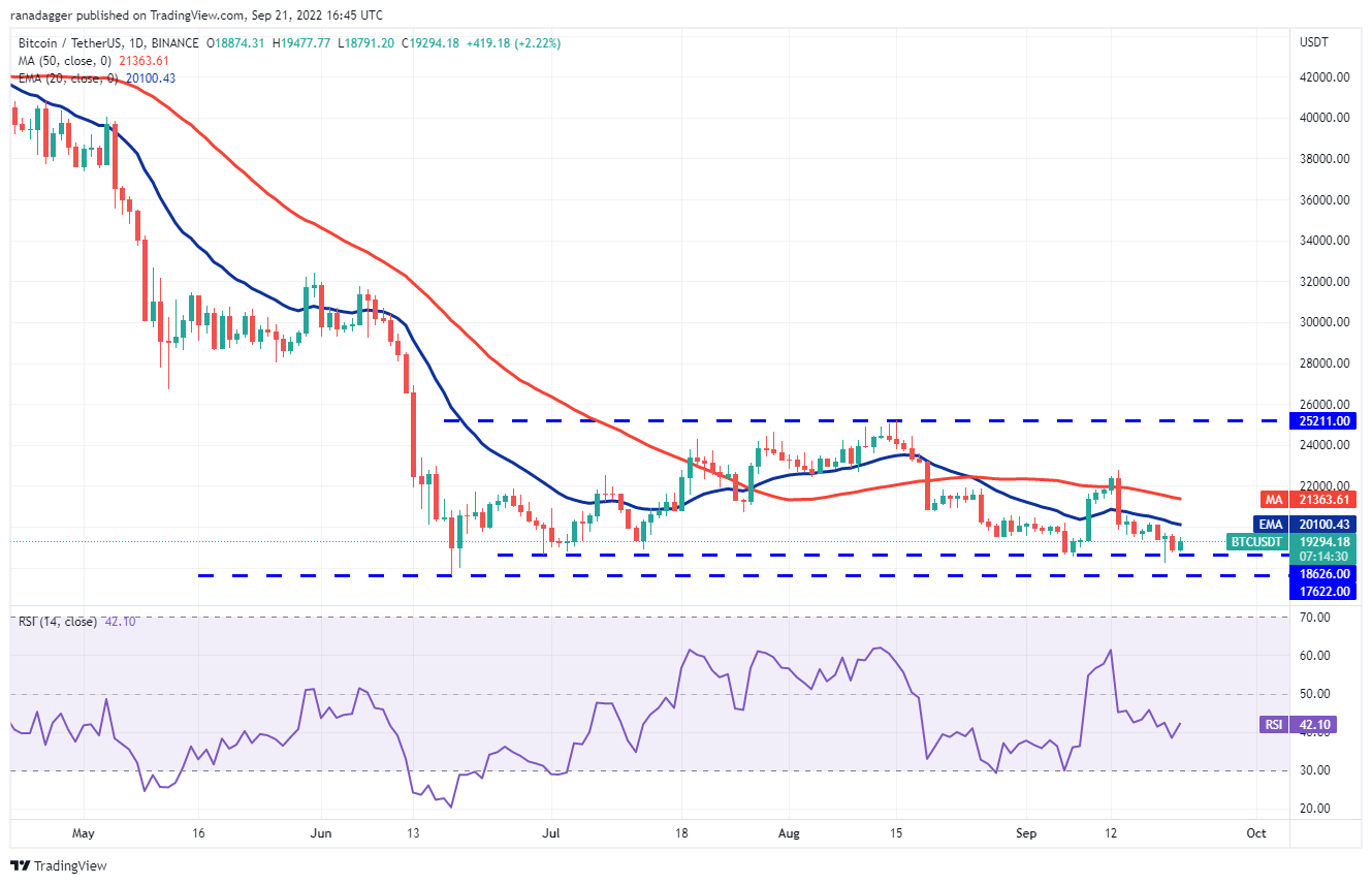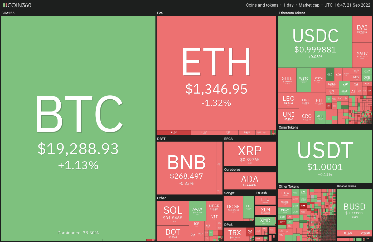 Bitcoin plunged below the immediate support at $18,626 on Sept. 19 but the long tail on the candlestick shows strong buying at lower levels. The bulls again defended the level on Sept. 21, which is a positive sign.