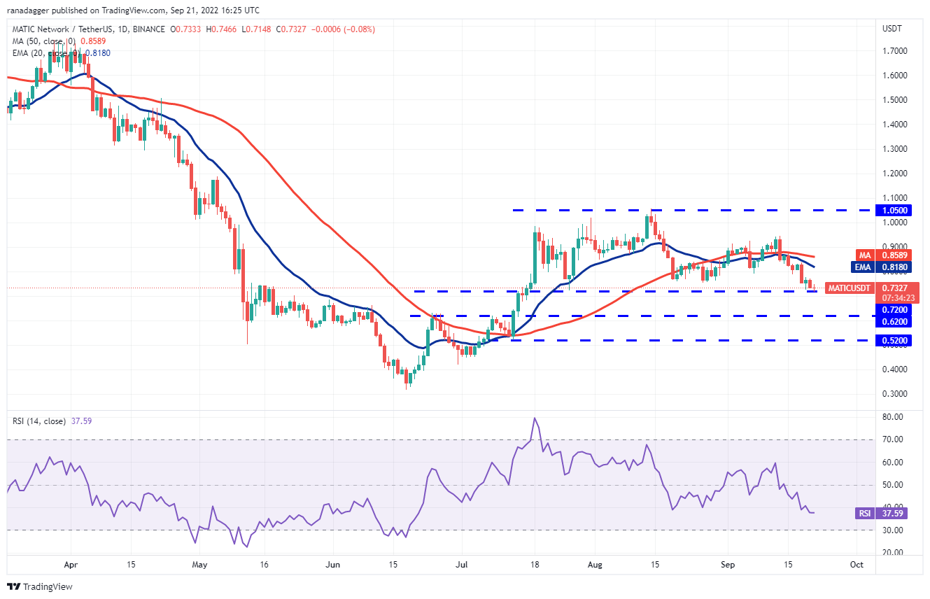 If the price bounces off $0.72, the pair could reach the 20-day EMA. This is an important level to keep an eye on in the short term. If the price turns down from this resistance, the likelihood of a break below $0.72 increases. The MATIC/USDT pair could then drop to $0.62 and later to $0.52.