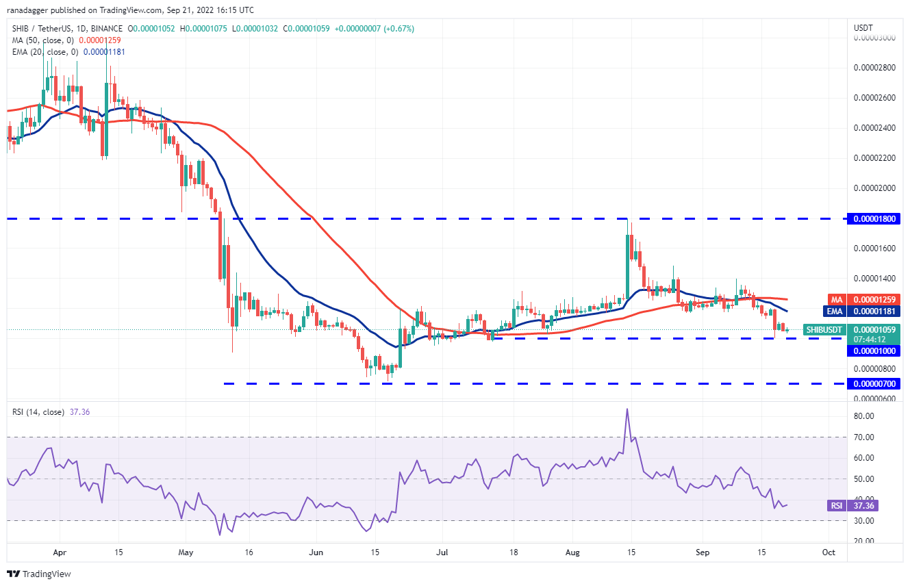 Shiba Inu (SHIB) bounced off the immediate support at $0.000010 on Sept. 18 but the bears stalled the recovery at $0.000011. The bears will again attempt to sink the price below the support at $0.000010.