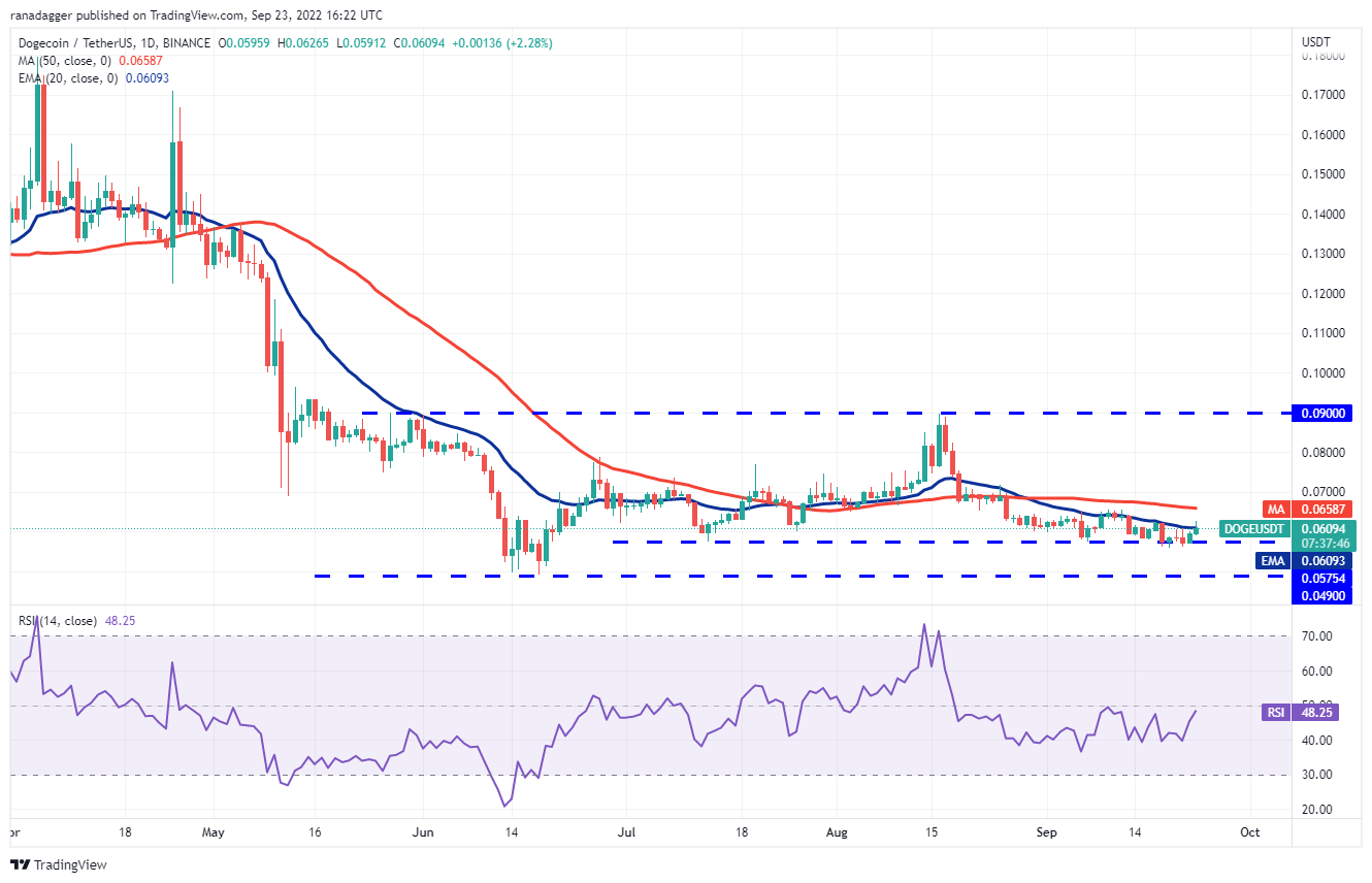 Buyers bought the dip below the immediate support on Sept. 21 but they are struggling to sustain Dogecoin (DOGE) above the 20-day EMA ($0.06) on Sept. 23. This suggests that bears continue to sell on rallies.