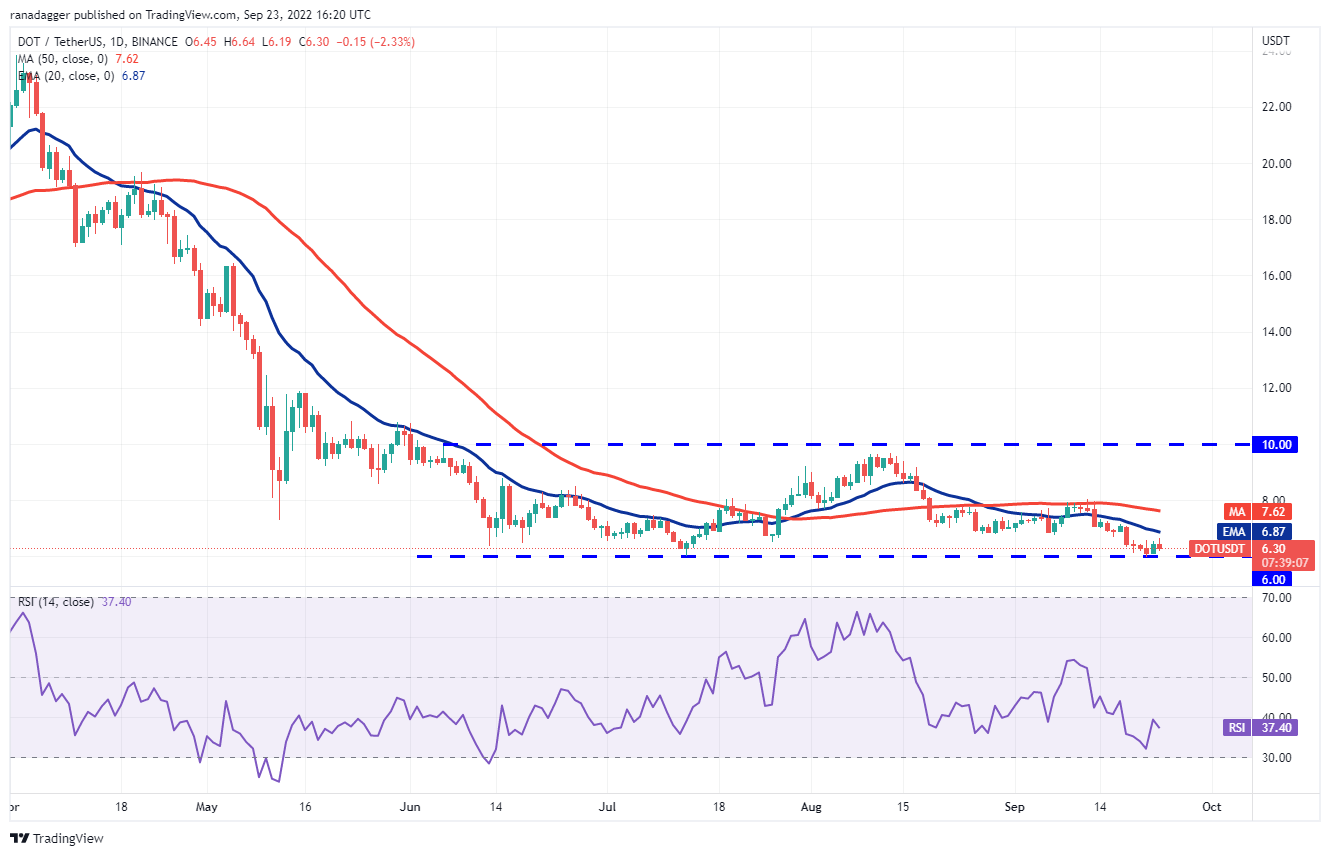 Buyers successfully defended the critical support of $6 on sept. 21 and 22 but the shallow bounce suggests that demand dries up at higher levels. The longer Polkadot (DOT) trades below the 20-day EMA (6.87), the greater the possibility of a break below $6.