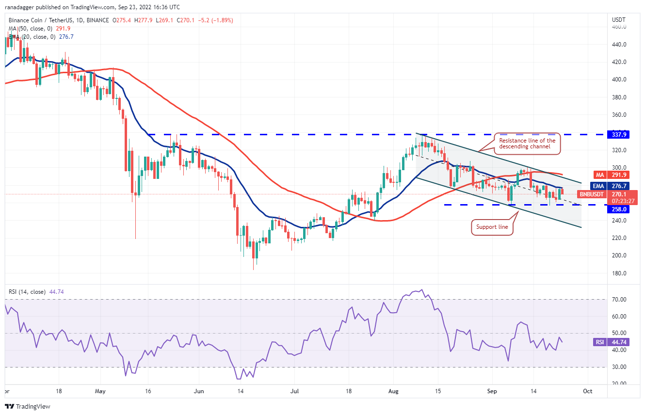 This tight-range trading is unlikely to continue for long. If buyers propel the price above the 20-day EMA, the BNB/USDT pair could rise to the resistance line of the descending channel. The bulls will have to overcome this obstacle to suggest that the corrective phase may be over. The pair could then attempt a rally to $338.
