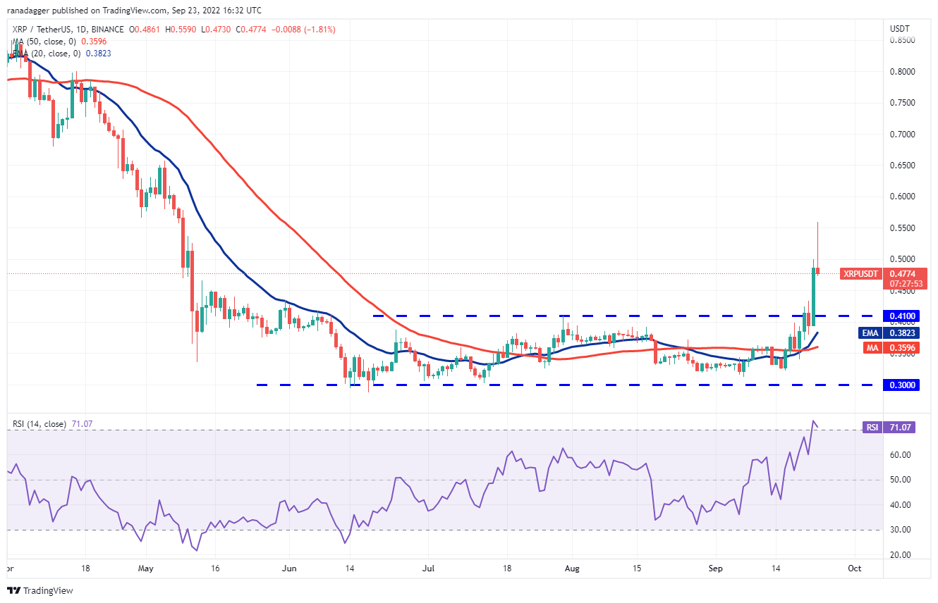 XRP broke above the $0.41 overhead resistance on Sept. 20. The bears tried to trap the aggressive bulls on Sept. 21 but the buyers had other plans. They purchased the dip with vigor and thrust the price above the overhead resistance on Sept. 22.