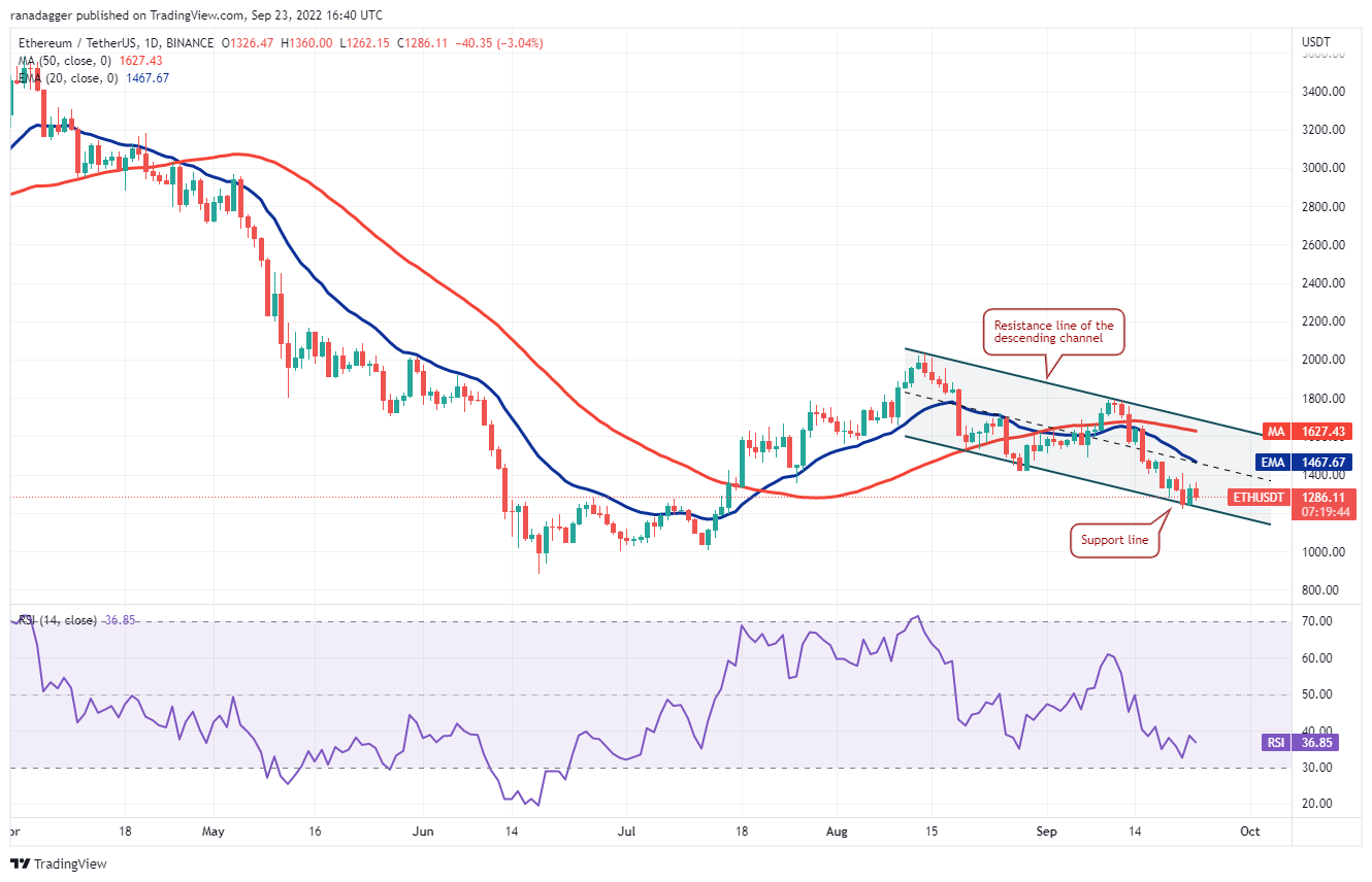 The bears tried to sink the price below the channel on Sept. 21 but the bulls defended the level successfully. The bulls will try to push the price to the 20-day EMA ($1,467) where they may face stiff resistance from the bears.